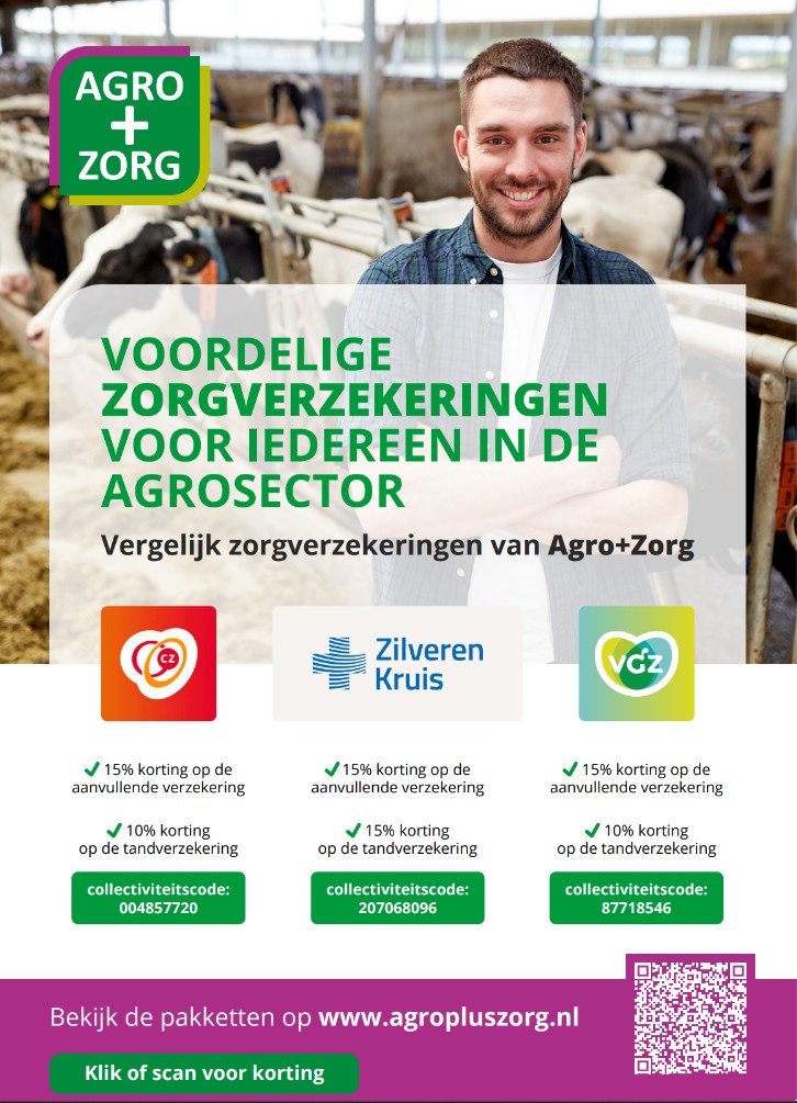 Het is natuurlijk mooi dat je als werkgever een aantrekkelijke korting krijgt via LTO op je zorgverzekering bij één van de gecontracteerde zorgaanbieders. Zou het niet mooi meegenomen zijn als ook jouw werknemers dezelfde goede voorwaarden krijgen? Daarom is er het Agro+Zorg collectief. Jouw werknemers zijn hiermee voordelig verzekerd bij CZ, VGZ of Zilveren Kruis. Bekijk de flyer van Agro+Zorg hiernaast en deel hem met je team.